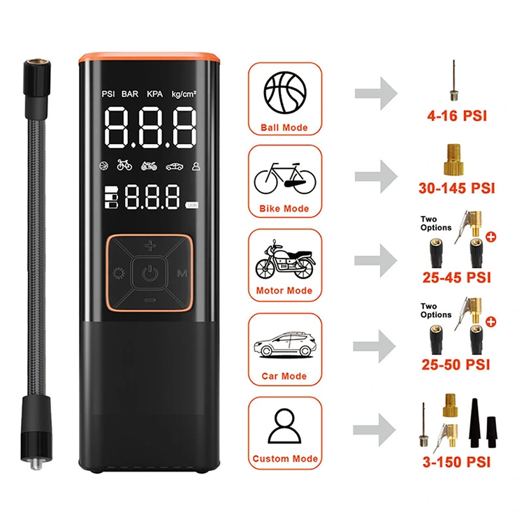 Druckeinheiten: PSI, KPA, BAR, KG/CM² und vier voreingestellte Aufblasmodi. Sie können den Druck der vier voreingestellten Modi entsprechend Ihrem Fahrzeug einstellen. Diese Luftpumpe ist geeignet für: