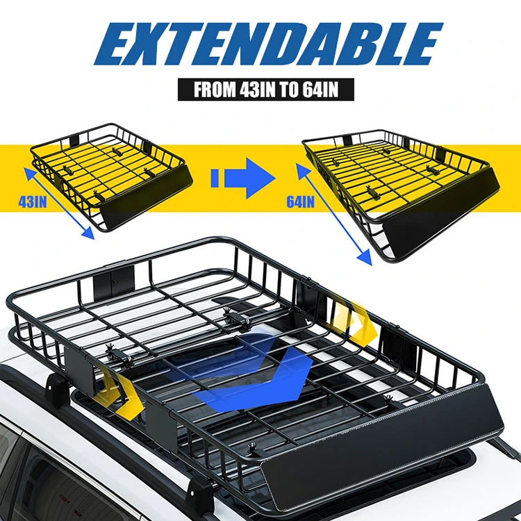 Ausziehbares Design: Dieser Dachträgerkorb verfügt über ein cleveres ausziehbares Design – Standardgröße (43" x 39" x 6") für Kleinwagen und erweiterbar auf bis zu 64" für größere Fahrzeuge, wodurch der Laderaum maximiert wird. Durch die zusammenklappbare Form lässt es sich bei Nichtgebrauch leicht zerlegen, transportieren und lagern. Es eignet sich für flexible Reise- und Aufbewahrungsbedürfnisse.